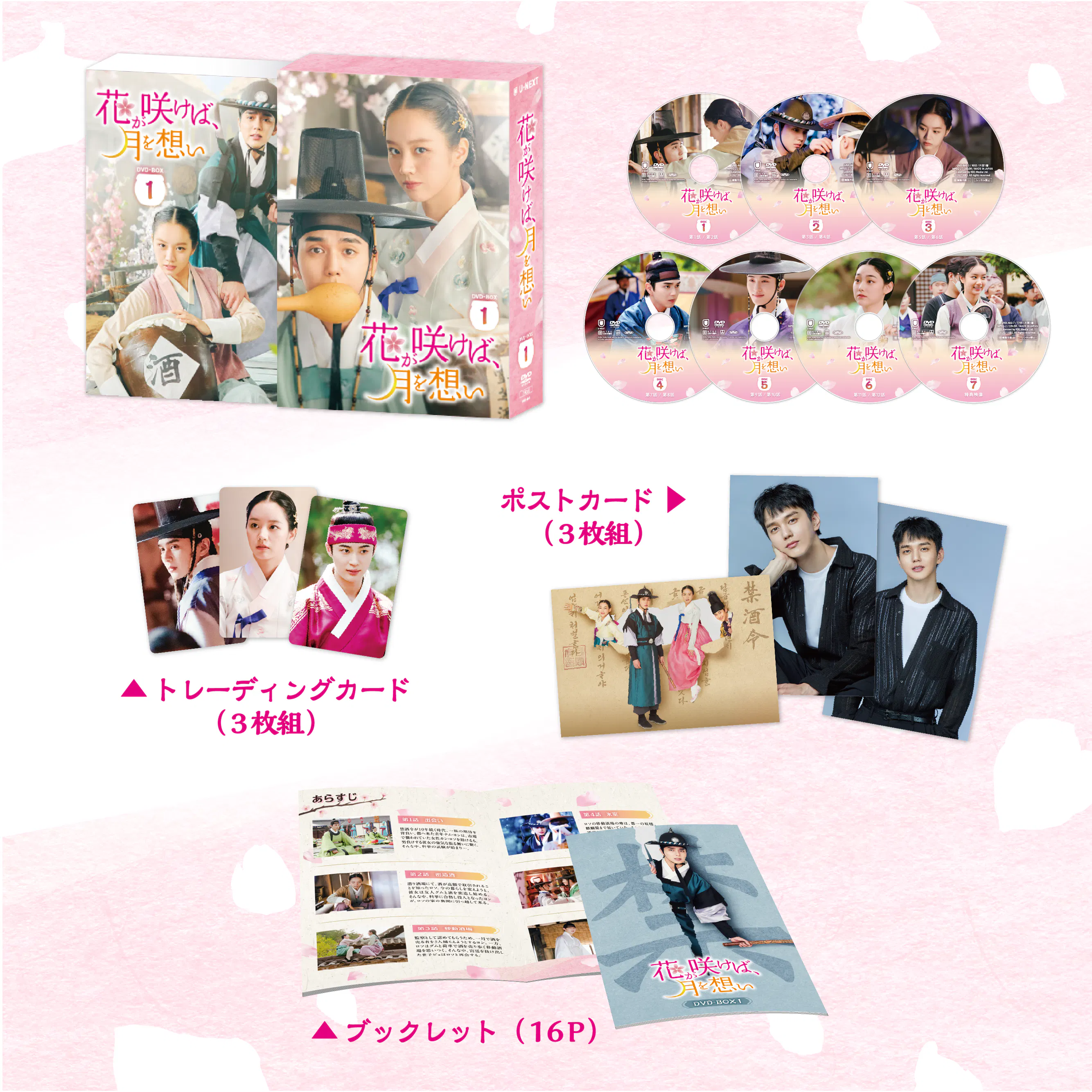 『花が咲けば、月を想い』DVD-BOX 1には、本編韓国語版に加え、日本語吹替版も収録。メイキングや、出演キャストによるインタビューなど、豪華特典映像も。封入特典には、ここだけのトレーディングカードや、ポストカードが封入されます。U-NEXT Asia ONLINE STORE限定発売です。ロマンス時代劇『花が咲けば、月を想い』DVD-BOX 1を、ぜひ、ご購入下さい。